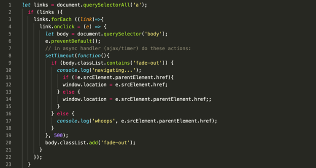 Any time a link is clicked, we first stop the load with e.preventDefault(). We then start a timer of 500 milliseconds. Right after that, we add our css class to the body. After the 500ms, we do two things: first, check if the class has been added. Then we have to check if the <a> tag is a parent element. Many times, <a> tags will wrap other elements, such as images. The reason for having to do this check has to do with the click event and how it bubbles, but that is slightly beyond the scope of this article. Next, we load the next page! How the animation works in this example is just a simple fade out and back in, using css animations.