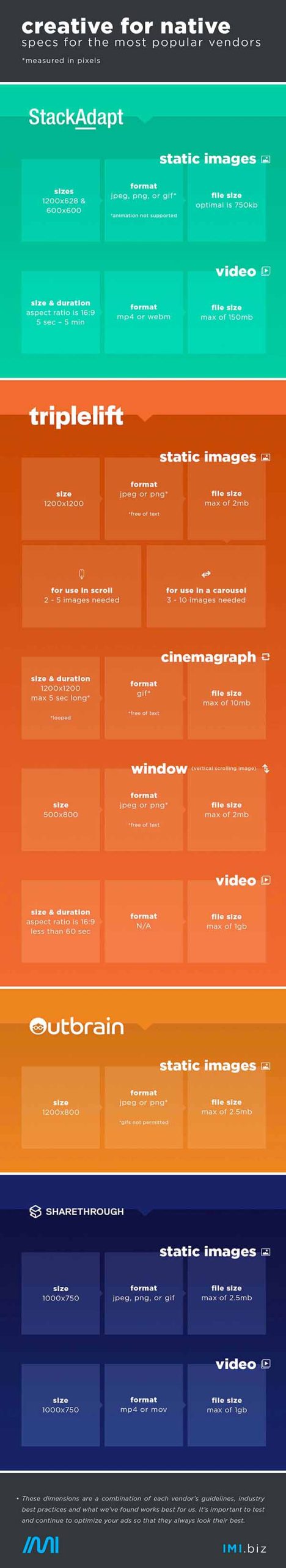 With this information in mind, designers should be optimizing and creating unique ads, not only for social and display but for native as well! The following infographic outlines the native creative specs, for the most popular vendors, in order to assist designers in making these disguised ads as beautiful as possible. Bookmark and share our spec guide to help assist with your upcoming native media images!