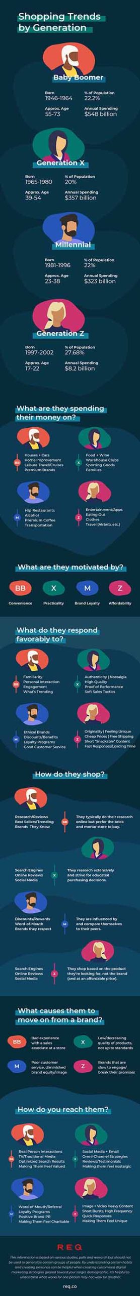Consumer spending makes up almost 70% of the US economy, and businesses are fighting for a slice of the pie. The more we can understand what motivates people to buy, the easier it will be to market to them. Check out the infographic below to see the breakdown of shopping trends by each generation.