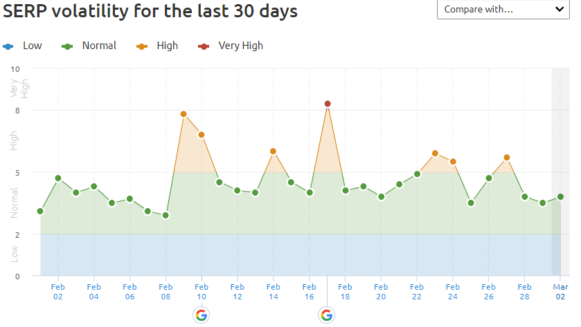 During the month of February, our tools reported significant volatility in the search results around February 10th and February 17th followed by additional waves around February 23rd and February 27th as displayed in the graph, below:
